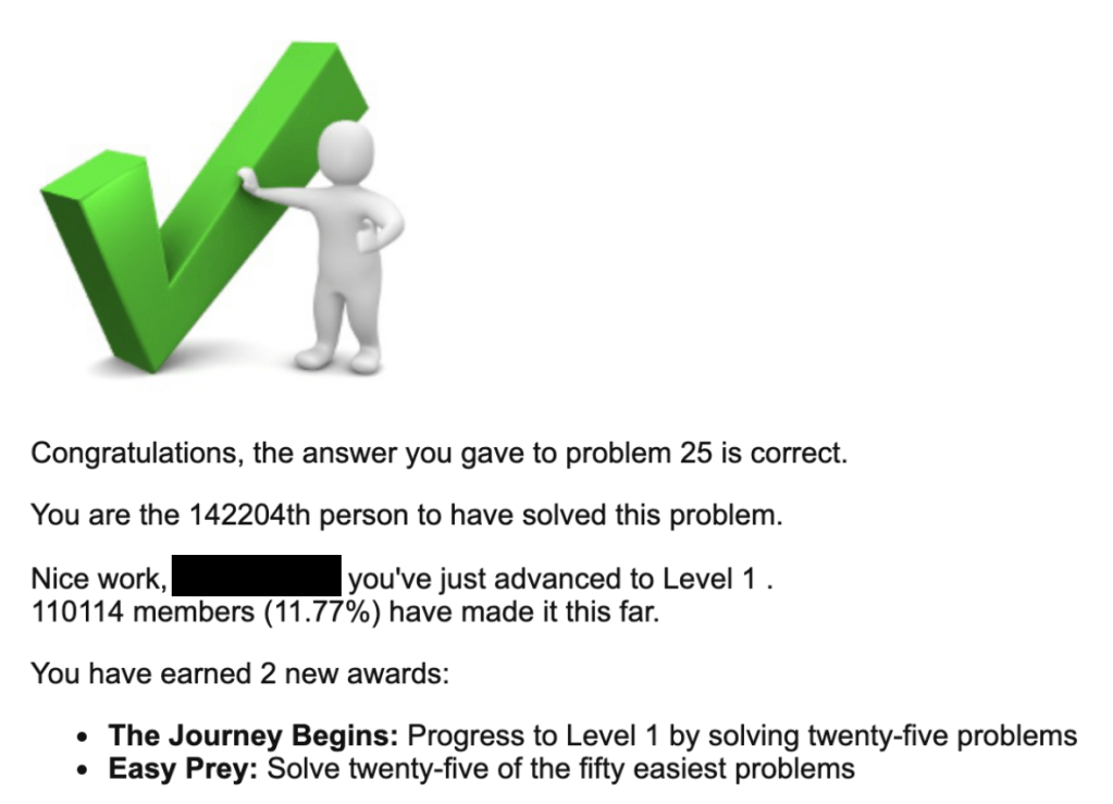 And with that, we have solved 25 questions, less than 1/26th of all of the problems on Project Euler. I got the achievements “The Journey Begins” and “Easy Prey” for reaching Level 1 by solving 25 problems and solving 25 of the 50 easiest problems, respectively after solving this problem. Here’s a screenshot of me reaching Level 1: